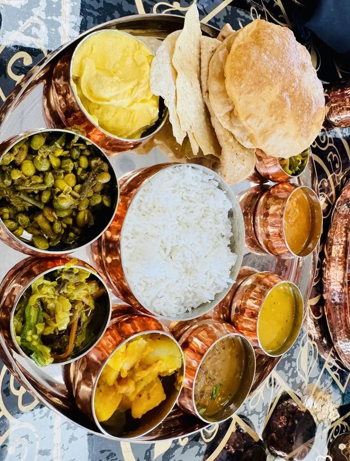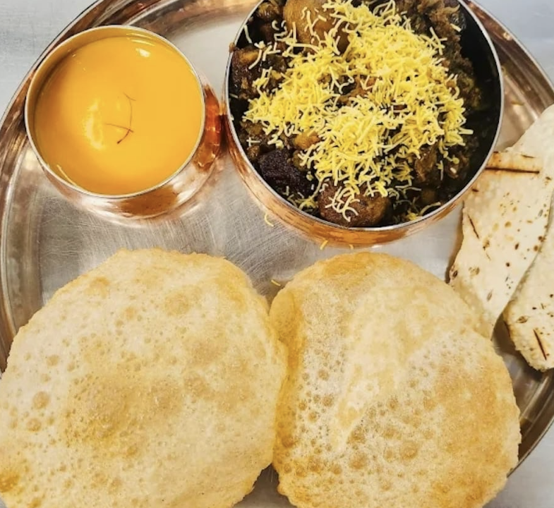 3 curries, dal, rice, 2 roti, 1 puri, farsan (snack), sweet, chhas, fryum
