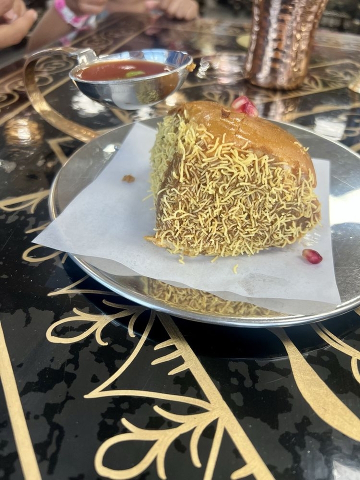 Potato fritter with dry garlic chutney in bun served with house chutney