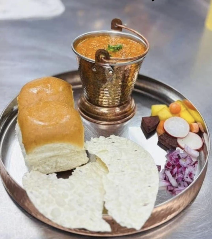 4 curries, dal, rice, 2 roti, 2 puri, farsan (snack), aamras, chhas, fryum