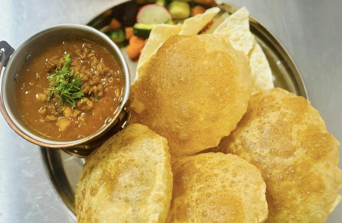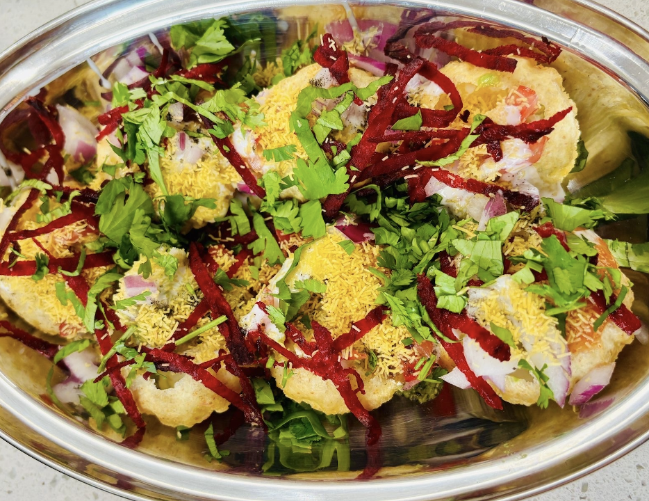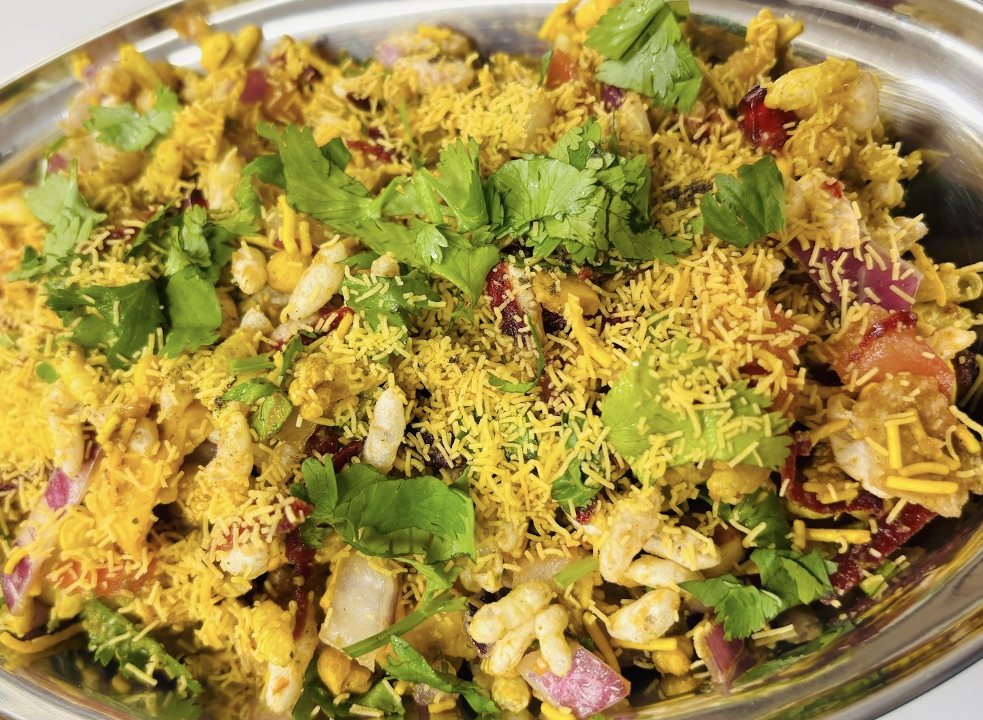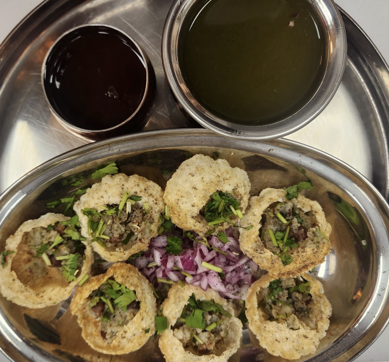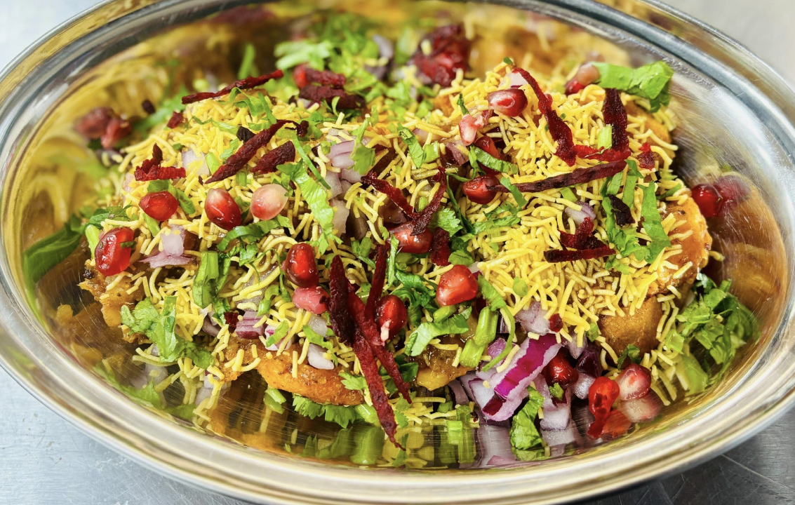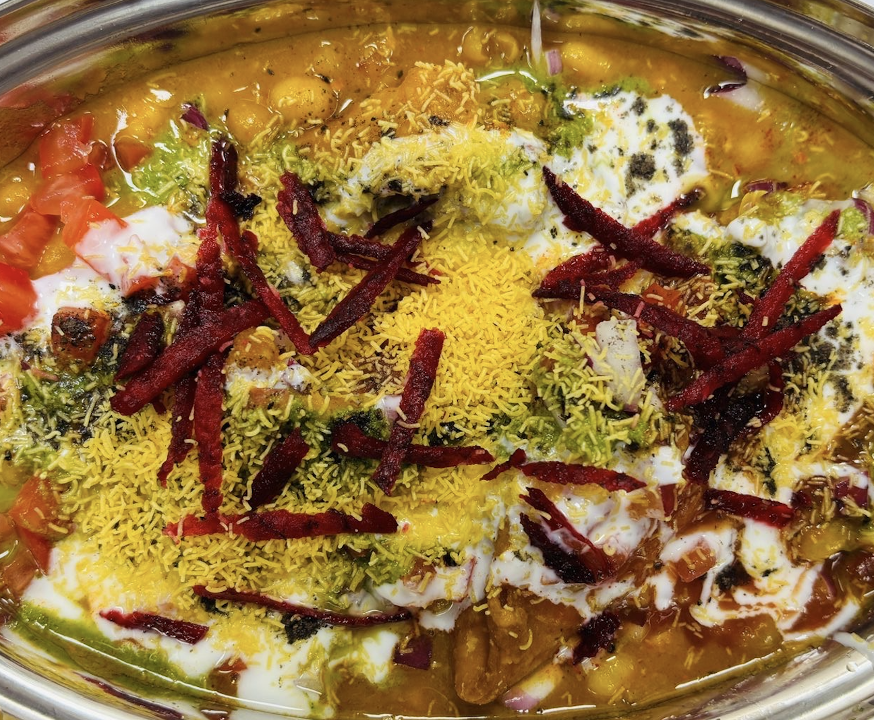 Crispy, golden potato patties served with flavorful white pea curry, topped with chutneys