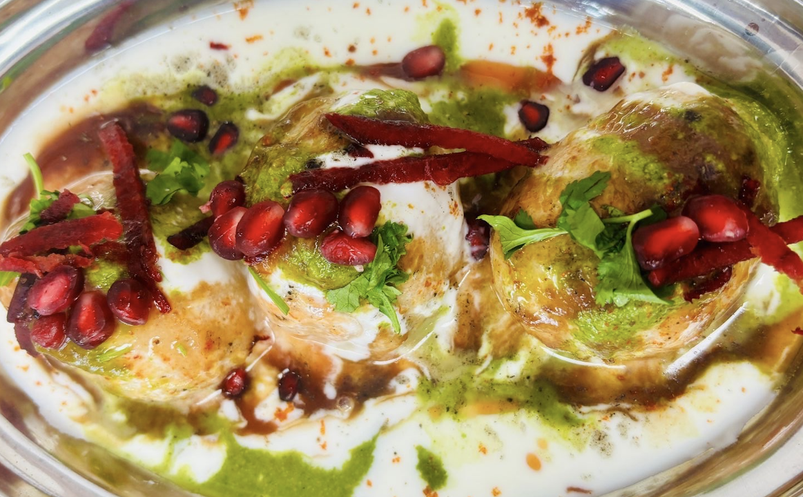 Soft and fluffy lentil dumplings soaked in creamy, chilled yogurt, topped with chutneys