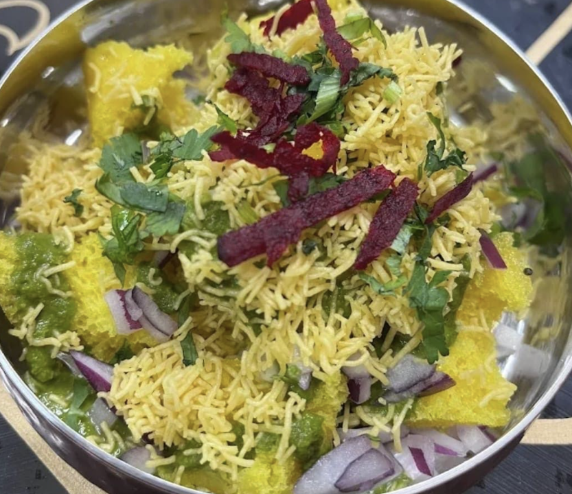 Steamed Chickpea cakes served with sweet, tangy, & spicy chutneys